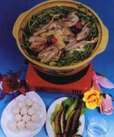 (4)炒锅置火上,下油加热,放姜蒜片,葱,鸽肉,炒香,掺白汤,放味精,鸡精,料酒,胡椒粉,烧沸,煮10分钟,除尽浮沫,倒入砂锅内,上台即可。
