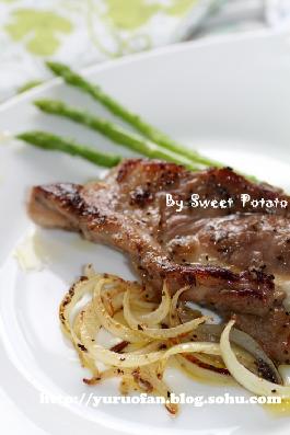 3、另一半洋葱切成丝备用;黄油放入平底锅内小火溶化,然后放入羊排小火煎2分钟后翻面,并放入洋葱丝一起煎2分钟,撒入少许黑胡椒碎后翻面再撒上少许黑胡椒碎,放入芦笋煎2分钟即可