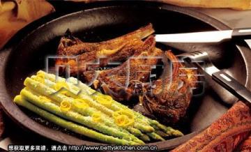 主菜用料:羊排骨8根(20cm/根),盐少许,现磨黑胡椒粒少许,配菜用料:新鲜芦笋500g,黄油2汤匙(30g),橄榄油2汤匙(30ml),新鲜柠檬(皮擦丝,果肉榨汁)1只,意大利现磨(或卡夫小罐装)芝士粉4汤匙(60g),盐少许,现磨黑胡椒粒少许