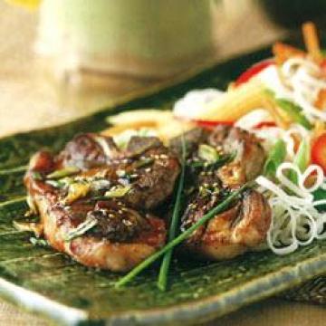青葱6根,芝麻2汤匙,低钠酱油60毫升,苹果醋2汤匙,蜂蜜2汤匙,大蒜1小瓣,剁碎,姜末3/4茶匙,带骨羊排8块(每块约112克),去掉所有可见的脂肪,米粉225克,中等大小的胡萝卜4个,红甜椒1个,玉米笋2棵,沥干,太白粉(生粉)11/2茶匙