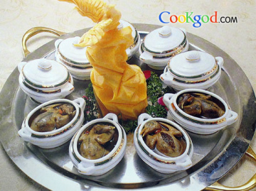 2、把制好的鱼翅纳入乳鸽腹中,用高汤炖至熟烂,调味即成。
