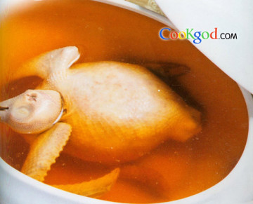 (1)三黄鸡整鸡出骨,鸡身用加料酒的开水烫变色取出,冷水洗净,翻正待用;