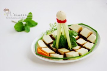 6.豆腐块的缝隙间填入六月香豆瓣酱,并用香葱、胡萝卜等装饰成羽毛球拍,将处理好的羽毛球放在拍上即可