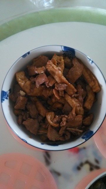 2.豆腐切长条,加入煮开,加适量酱油,煮至快干便可.