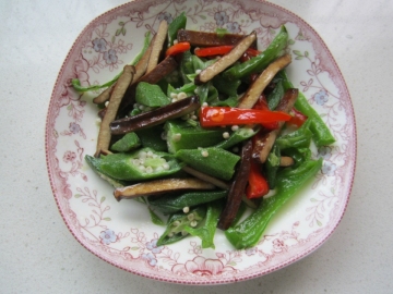 秋葵100克,青红椒各1个,香干少许,油、盐、鸡精适量。