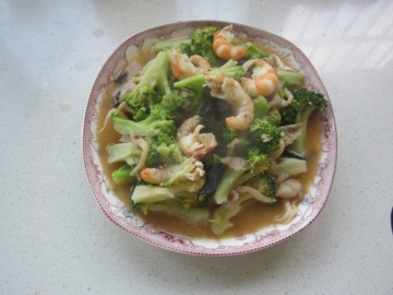 西兰花200克,平菇100克,虾100克,木耳少许,油、盐、葱姜、料酒、鸡精适量。
