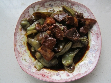 3、另起锅放油煸炒扁豆,放烧好的肉片、酱油焖煮10分钟。