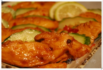 7、煎好的鸡胸片各片和黄瓜放一起,在放上两片青柠檬,上桌时,可以清晰地飘过青柠檬的香;