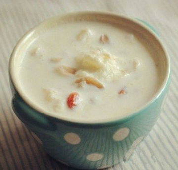 2、倒入牛奶后加热的时间不必过长,略煮一会就可以了,然后随着降温的过程,将炒米再多泡一泡,温度口感就正合适了。因为炒米本身是熟的,所以略加热浸泡就可以了。