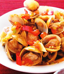 咖哩炒孔雀蛤、炒芦笋贝、生炒鲜干贝、沙茶炒螺肉
