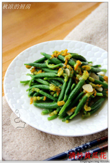 黄瓜花很鲜嫩也很清香,只调少许盐即可,此菜旺火快炒出锅才有脆嫩的口感。