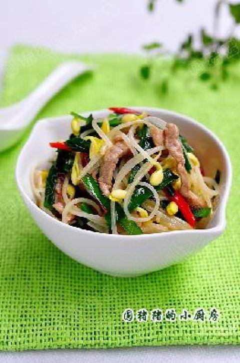 1.备锅水滚,下豆芽,韭菜川烫捞起备用.