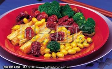 主料:鲜腐竹,瘦肉3两,蘑菇,青豆2汤匙,胡萝卜,蒜头1粒,姜片。