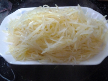 土豆切丝,漂冷水至水清为此,再泡,等到临炒前再滤水。红萝卜和葱切成丝。