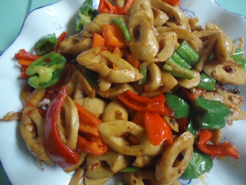 面筋,青椒,红椒,干红辣椒,麻椒,葱花,姜丝,味达美酱油,十三香,老抽