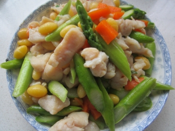 毛豆香菇胡萝卜白果鸡丁、猪肉炒香干、西红柿炒蛋。