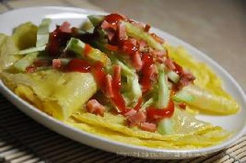 4.将黄瓜切丝、火腿切丁(手头仅有这些料)撒在饼上,最后浇上番茄沙司。我的做法是为了拍照所以没卷。