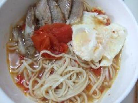 凡凡屋鸡蛋面一小把,土鸡蛋一个,剁椒二匙,番茄以一个,卤肉一小块