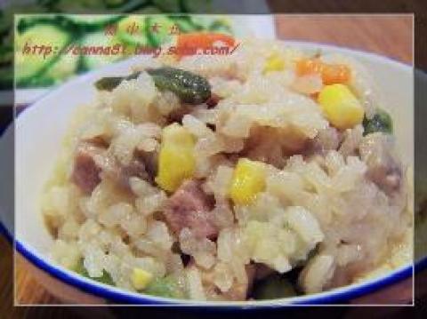 1.配料其实不怎么复杂,我买的一包一包的冷冻蔬菜丁,化冻后和土豆丁,牛肉丁,蘑菇丁炒好后,把所有材料倒入电饭煲里,和米饭混合。