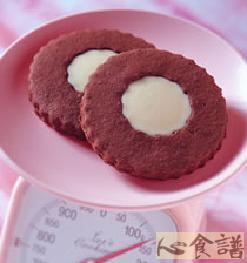 4.将作法3的面糰用大圆型压模压出两块饼干,其中一块再用小圆形压膜压除中间的圆形部分,边缘用刷子抹上材料b的鲜奶,将2块饼干重叠在一起。