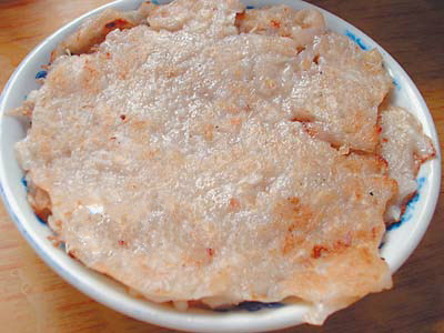 2.以上两种原料混成糊状,加入虾米、腊肉、猪油、胡椒粉,酱油、味精、精盐等拌匀蒸熟。