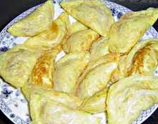 3.将豆腐衣切成直径10厘米圆片,逐片摊开,每片先放豆腐糊(大半调匙),再放入熟馅心(小半调匙),对折成半月形蛋饺,约做成20只,上笼蒸10分钟,取出冷却。