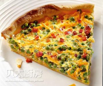 面饼用料:面粉250g,发酵粉1茶匙(5g),盐1/2茶匙(3g),油3汤匙(45ml),清水100ml,馅用料:速冻豌豆300g,胡萝卜300g(擦碎),洋葱1个(切碎),培根100g(切碎),牛奶200ml,鸡蛋2枚,百里香碎1茶匙(5g),盐1/2茶匙(3g),胡椒粉1/3茶匙(2g)
