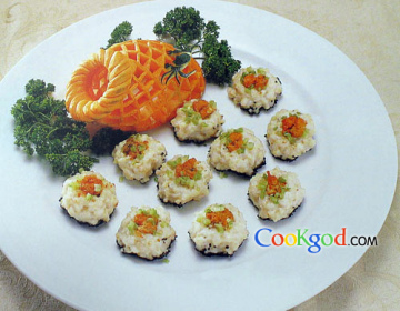 2、将小棠菜丁与鱼粒拌匀至上劲,制成鱼饼生坯,入油锅养熟,滚芝麻煎香,点缀蟹黄,装盘即成。