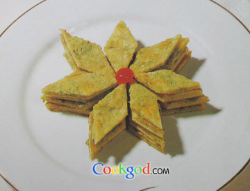 2、锅烤热,淋油,倒入调好味的芹菜糊,两面煎黄盛出,改刀拼盘。