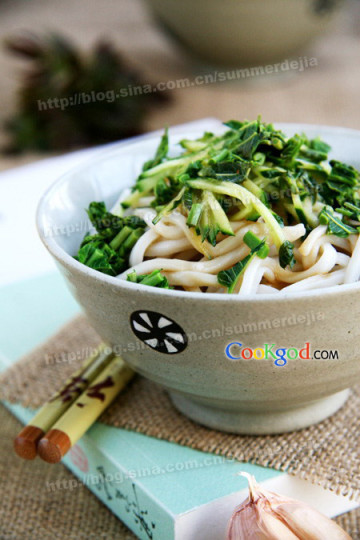 8.煮好的面条过一遍凉水,捞到碗里,撒上香椿末和芝麻酱,拌匀就可以大快朵颐了,绝对的清爽,让春天在你的嘴边绽放。
