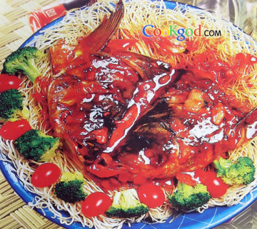 3、炒锅上火放油烧热,加入猪肉丝煸炒变色,倒入葱花、姜末、蒜片、干辣椒,炒出香味后,放精盐、味精、鸡精粉、白糖、老抽、番茄酱、醋进行调味,鱼头放入,焙五分钟左右,待呈红亮色时勾入适量湿淀粉,取出放在炸好的拉面上,把剩余的芡汁浇在鱼头上。