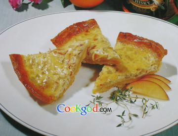 (1)用黄油将洋葱粒、培根粒炒香;开面团擀成面皮,放入模具中烘烤成形,取出备用。