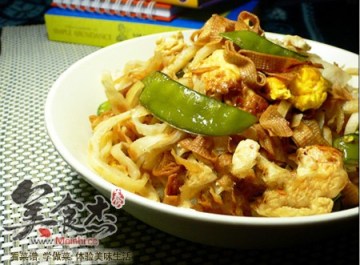 3、炒锅留底油,油热之后下姜碎,下荷兰豆和豆腐皮,大火翻炒,然后下炒好的蛋清和蛋黄块,加入适量的辣椒酱和酱油,翻炒上色,加一碗温水,下饼条,盖盖焖上;