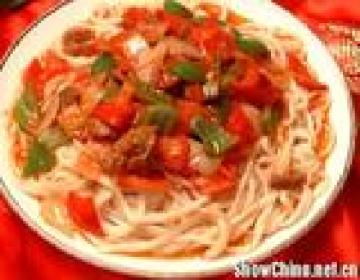 把锅烧热加入油,放肉把肉炒白,放入洋葱辣椒翻炒。加盐,胡椒,味精,鸡汤少量。最后放西红柿翻炒即可。