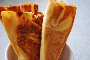 煎饼铺上,卷上菜,成为三角形