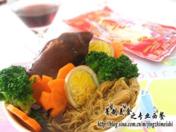 6. 煮面条: 面条直接放入烧开的水中煮至熟.不用放任何调味料,煮好后捞出装入几汤匙的猪脚卤水拌在一起就可以了.