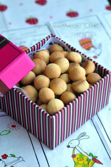 黄油80g,蛋黄2个,糖粉35g,低筋面粉65g(元子用40g),玉米粉40g,奶粉15g,吉士粉1t,泡打粉2t