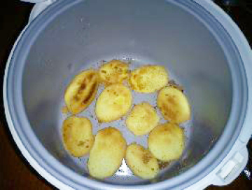13.将电饭煲内胆放入电饭煲中,开始加热至边缘变黄,约20分钟(电饭煲小,结果加热过程中,面团涨到粘盖儿了……)