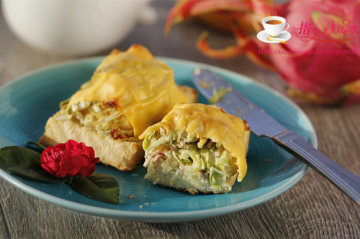 4. 将混合好的菜团摆放在面包片上, 再在上面盖层芝士片(我用的是减脂芝士), 最后再放入烤箱中, 180度, 20分钟,芝士表面金黄即可。