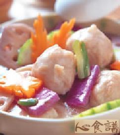 鱼丸4个,莲藕50公克,白山药20公克,紫山药20公克,菜瓜50公克,葱10公克,蒜头10公克,姜10公克,太白粉1小匙,盐少许,糖少许,高汤2大匙,米酒1小匙