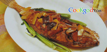 8.炒锅上火加底油烧热,下入葱、姜、蒜炒黄出香,下入香菇、冬笋、板油丁稍煸,下入炸好的鱼,加入料酒、高汤100毫升、酱油、味精、白糖,用小火炖15分钟捞出装盘;
