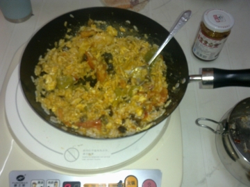 5.放入馒头丁一起翻炒,加入适量的生抽,盐调味