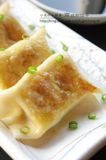 3.面在擀成皮以前要再揉至少一次,让面更筋道;擀皮包饺子;包得差不多的时候(大约可以包15个饺子),锅里放少许油,油7成热以后放入饺子,小火煎1分钟,底儿金黄以后,淋少许热水,盖上盖子焖一小会儿,到饺子皮变得透明以后,掀开盖子,把饺子的另外两面煎一下就好了。