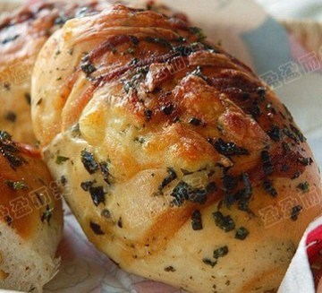 4.发酵好的面团中间划开。喷水后入烤箱。190度,烤10分钟。取出,在中间塞入馅料。刷蒜油,再加烤8分钟。