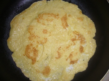 2.等表面的面糊凝固以后小心翻面盖锅盖。等两面都煎成金黄色离火装盘即可。