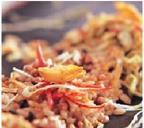 2.剩下的2/3料,再加入沥干的米,一起用大火拌炒,然后加点酱油及少许塩,炒快干加入酒呛锅,然后再放入高丽菜用大火拌炒一下子.