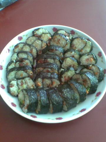 2、鱼香煎后加入酱油、白糖、淀粉、少许醋、料酒熬干后,寿司饭卷起来跟我一样上面铺鱼后用紫菜条装饰也能做成好吃的独创菜式。