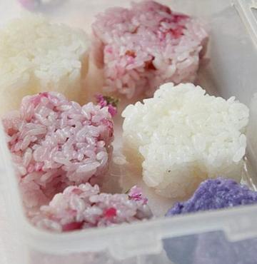 1、因为我们要做三种颜色的饭团,所以先将米分成三等份,每份100g白米+10g糯米。将米洗净,浸泡20分钟。取一份加200g清水,上锅蒸熟。米饭熟后再焖5分钟(因为每一份米饭量都不多,会很快煮好,焖的时间也相对缩短),然后加入适量的寿司醋(今天的糖比重要多一点),拌均匀,铺在保鲜膜上自然冷却。晾凉后用模具整型即可。