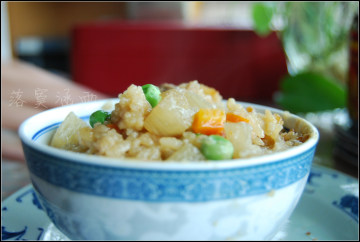6、饭好后,将豌豆在微波里微1分钟,也倒入饭锅中,排骨饭就可以吃了。