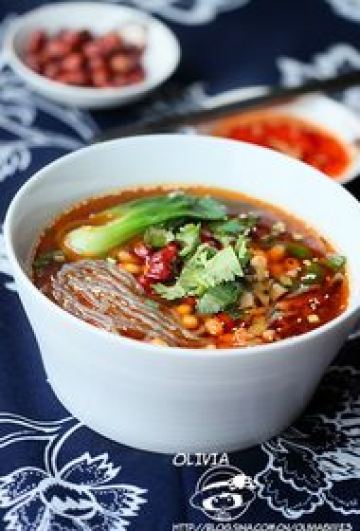 原料:粉条,葱末、姜末、蒜泥,豌豆尖、香菜、炸菜丝、香芹末、酱油、醋、辣椒油、香油,猪油、炸酥的花生豆和黄豆,花椒粉、胡椒粉、味精、鸡精,盐、芝麻,还有用鸡汤或骨头煲的老汤。